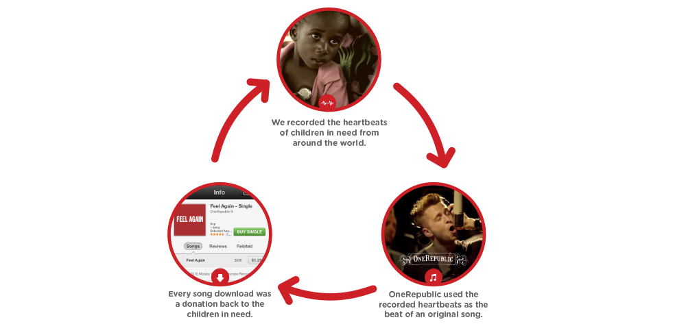 We traveled to Malawi and Guatemala to record the heartbeats of children in need with a special stethoscope. We then turned to Grammy nominated band OneRepublic to use the actual heartbeats as the beat of an original song called ‘Feel Again’; a song that people could download to help save millions of children around the world.