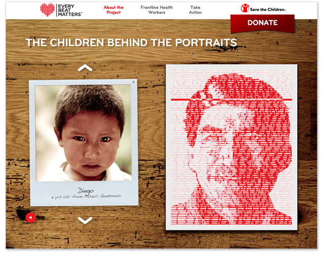The portraits of the health workers are constructed from actual heartbeats of children in need. When a user clicks on an EKG line, they can see a real portrait and listen to the heartbeat of the actual child it came from.
